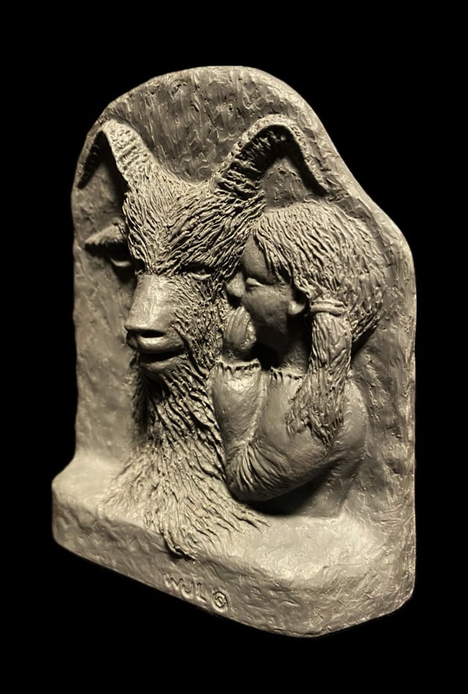 Black Phillip #2 is a flat back, free standing resin model kit. It measures approximately 3.75" tall x 3" wide x 1" deep.